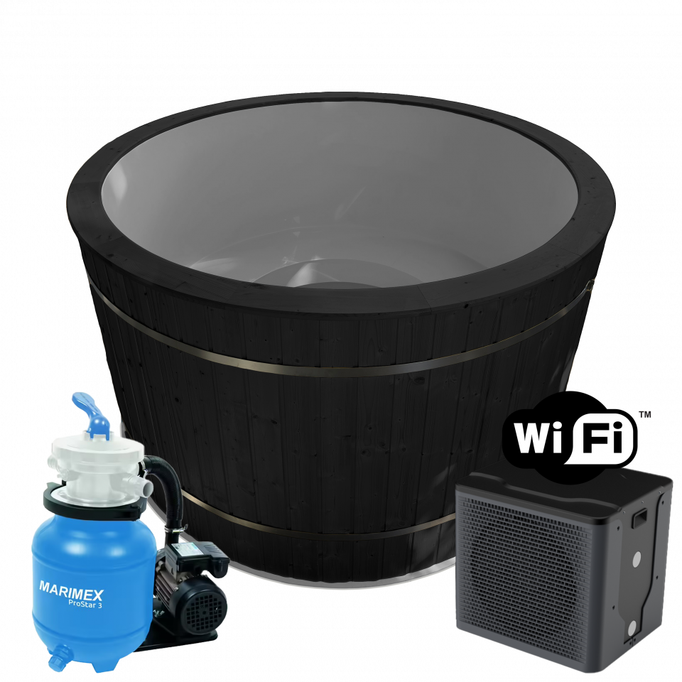 Kúpacia kaďa 160cm / 180cm - set - tepelné čerpadlo - piesková filtrácia, piesok do filtrácie, so zabudovanou lavicou, thermo izoláciou plášťa a povrchovo upraveným obkladom z dreva, kaďa na vodu, kade na kupanie