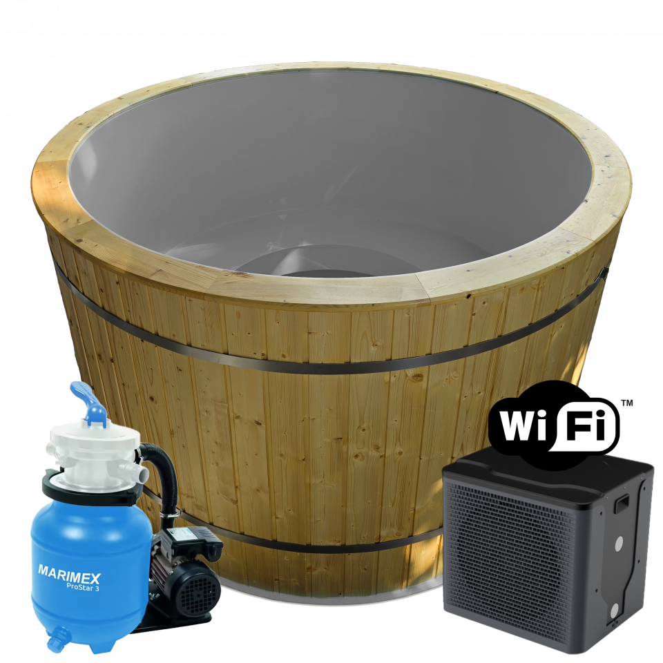 Kúpacia kaďa 190cm / 210cm - set - tepelné čerpadlo - piesková filtrácia, piesok do filtrácie, so zabudovanou lavicou, thermo izoláciou plášťa a povrchovo upraveným obkladom z dreva, kaďa na vodu, kade na kupanie
