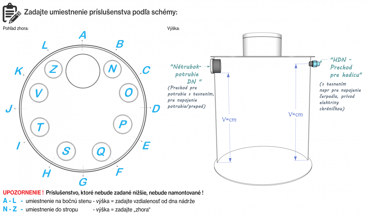 Na nádrž je možné namontovať rôzne prechody pre potrubia či hadice v ľubovoľnom počte, napríklad prechody pre potrubie - nátrubok DN32-DN250 alebo pre hadice HDN20-HDN110. Presné umiestnenie, typ, priemer a počet vyznačíte v košíku pred dokončením objednávky.