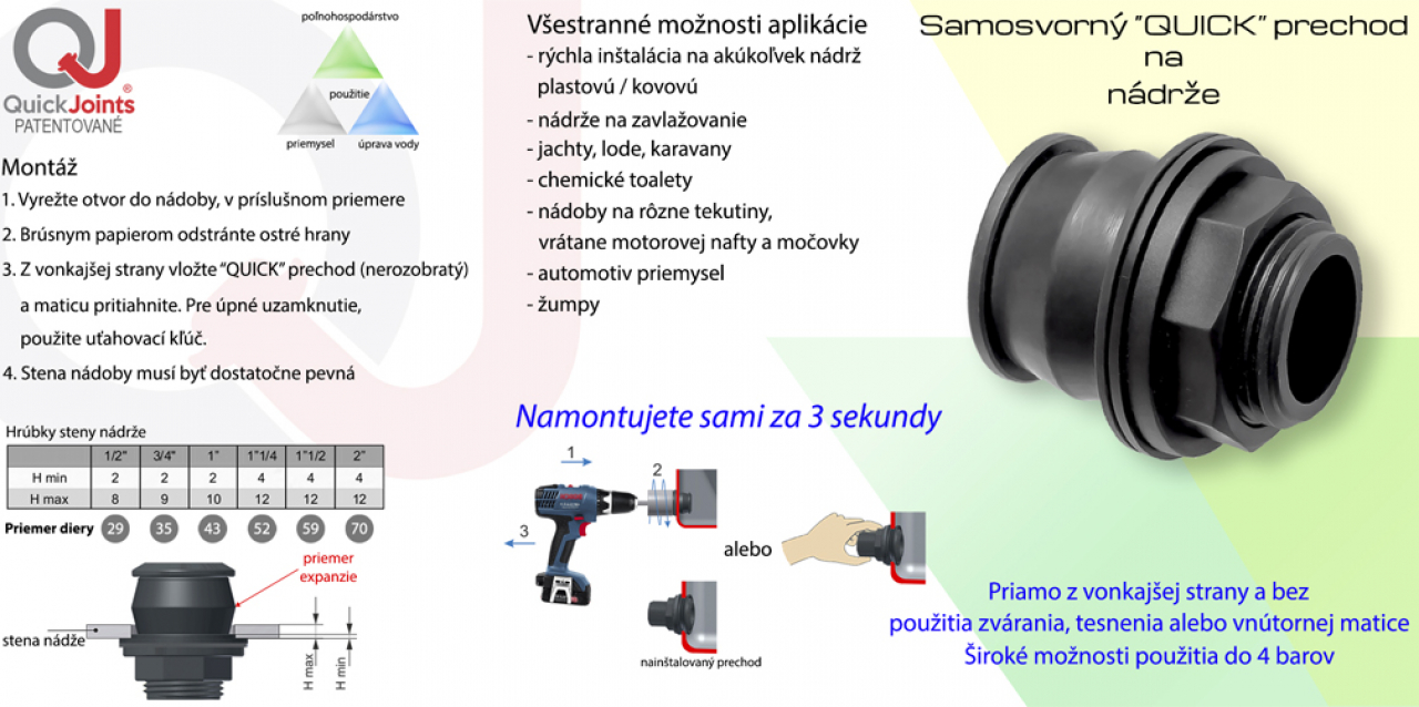 Jednou z charakteristík Quick Joints je ľahkosť a rýchlosť použitia: armatúru je možné inštalovať na steny nádrže priamo z vonkajšej strany, nepotrebuje zváranie, tmely ani poistné matice. Inštaláciu je možné ľahko vykonať iba jednou osobou za niekoľko sekúnd, nevyžaduje údržbu a vďaka svojej vysokej odolnosti voči teplotným vplyvom a nekorodovaniu zaručuje dlhú životnosť v akomkoľvek priestore s vynikajucim utesnením do 4bar.